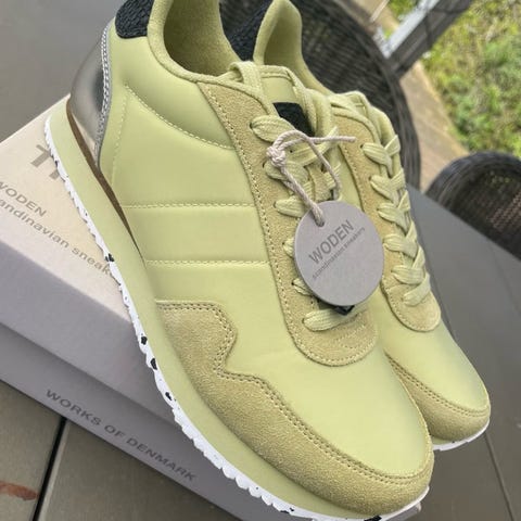 Woden sneakers i størrelse 39. Modellen er i en lys gul farve med snørelukning og mønstret ydersål. Overdelen fremstår i et let tekstilmateriale med mesh-lignende struktur. Velegnet som hverdagssko eller til let fritidsbrug.