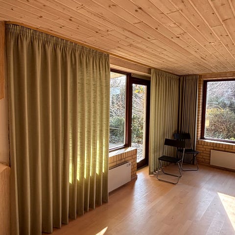 Lyse cremefarvede gardiner til vinduer og terrassedør. Gardinerne er lette og halvgennemsigtige, velegnede til stue, køkken eller andre opholdsrum, hvor der ønskes afskærmning uden at lukke alt lys ude. Passer til almindelige vinduesmål og høje dørpartier, afhængigt af mål på de enkelte længder.