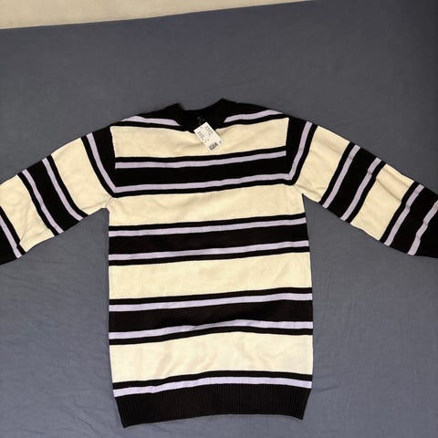 H&M Divided knælang sweater til kvinder i størrelse xs. Strikken er i akryl og har et multifarvet mønster i sort og hvid, der minder om dyreprint. Modellen har rund hals, lange ærmer og ribkanter ved hals, ærmer og forneden. Velegnet som hverdagsstrik eller til lag-på-lag outfits i køligere vejr.