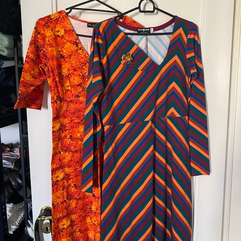 Margot hverdagskjole i bomuld i str. M. Kjolen er multifarvet med sort/hvidt mønster og røde detaljer, herunder et rødt bælte i taljen og røde lynlåse ved ærmerne. Modellen har lange ærmer og rund udskæring med sort kant. Velegnet som hverdagskjole til kvinder.