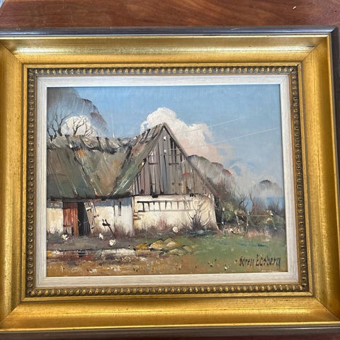 Isat sølvfarvet ramme hos glarmester med hvidt passepartout, som dog ses at bule lidt indeni rammen