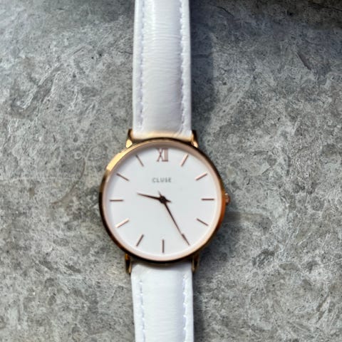 Smukt ur med læderrem. Der er lige kommet nyt batteri i. Brugsspor på remmen som ses på billedet.