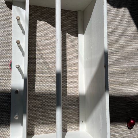 hylde i træ med tre stænger og bundplade. Hylden er udført i lakeret træ med synlig årestruktur. Den kan anvendes til opbevaring eller udstilling, f.eks. i køkken, stue eller entré, og kan monteres på væg. Designet giver mulighed for at hænge eller lægge genstande på de vandrette stænger samt placere ting på den nederste hylde.