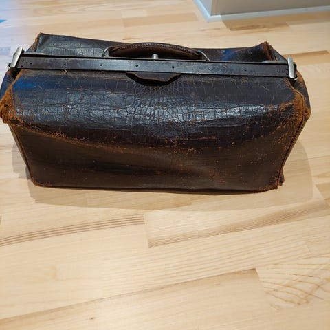 Tasken er patineret og med slid og skinnen med hpbdtag er rustet. Ingen huller. Åbner og lukker fint og låse er ikke angrebet af rust. . Røgfrit hjem.