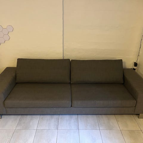 Det er en gammel sofa som jeg købte brugt fra 2,5 år siden, da jeg først lige var flyttet hjemmefra. Min kat har revet lidt i betrækket ved armlænene, så det beige betræk er lidt slidt.