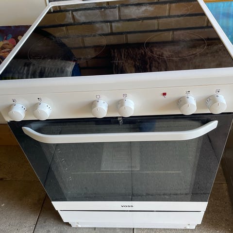 Bosch keramisk komfur med glaskeramisk kogeplade og integreret ovn. Komfuret har betjeningsknapper på fronten til både kogeplade og ovn. Velegnet til almindeligt køkkenbrug, madlavning og bagning.