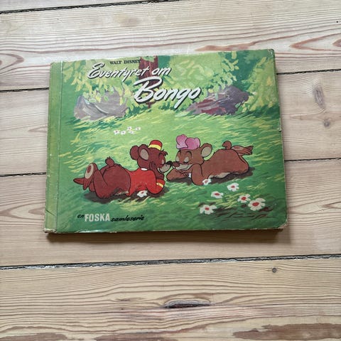 Disney Eventyret om Bongo klistermærkealbum. Album med illustrerede sider og felter til klistermærker/billeder fra historien om Bongo. Indeholder tekst og farvelagte illustrationer. Velegnet som samlerobjekt for Disney- og tegneserieinteresserede eller som nostalgisk børnebogsalbum.