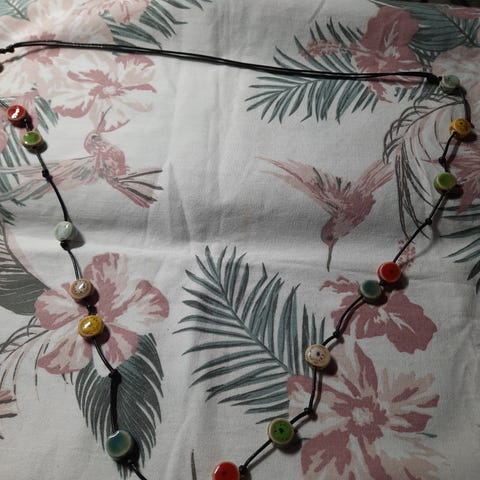 Et lille farveglimt til din garderobe – håndlavet halskæde med smukke stribede perler og varme jordfarver. Justerbar længde og perfekt til både sommerkjoler og lag-på-lag boho-look.