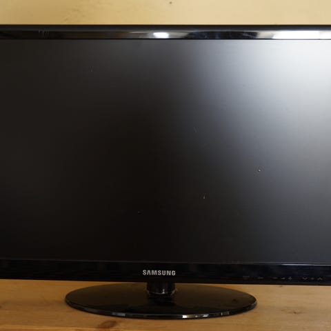 Samsung TV-skærm til brug som computerskærm via HDMI-kabel (ikke inkluderet). Den fungerer pålideligt og kan bruges til almindeligt kontorarbejde, internet og medieafspilning afhængigt af den tilsluttede enhed.