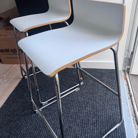 2 stk Hay barstole med polstret sæde i blå tekstil og hvidt metalstel. Egnet til brug ved højt bord eller køkkenø. Enkel, åben understelskonstruktion med fodstøtte for ekstra komfort. Velegnet til indendørs brug i køkken, alrum eller barområde.