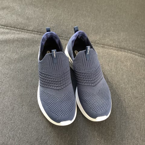 Skechers Slip-ins sneakers i str. 41. Modellen er en slip-on sneaker med strikket overdel i mørkeblå tekstil og lys mellemsål. Skoene har elastisk, sokkelignende pasform uden snørebånd og polstret sål, der giver komfort ved daglig brug. Velegnet som hverdagssko eller let fritidssko.