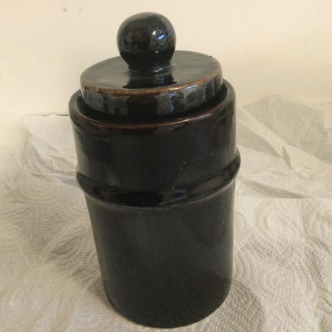 Portugisisk, saltglaseret stentøjskrukke med låg