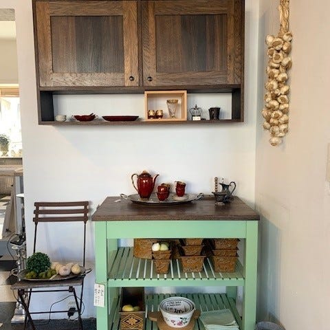 Malet i flot gul farve og med håndtag i grøn nuance - farverig og dekorativ