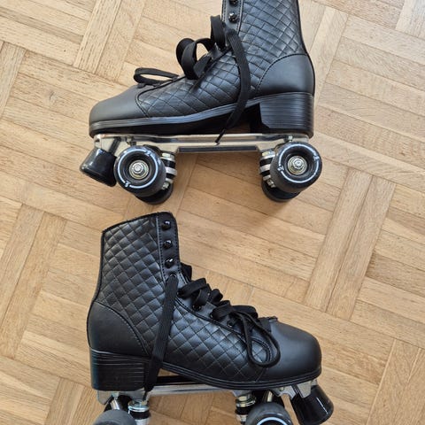 Sorte læder SFR Sovereign side by side rulleskøjter i størrelse 39. I rigtig god stand, er brugt meget lidt, og mest indendørs. Der er sat ekstra lange snørebånd på, men de originale sorte følger med.