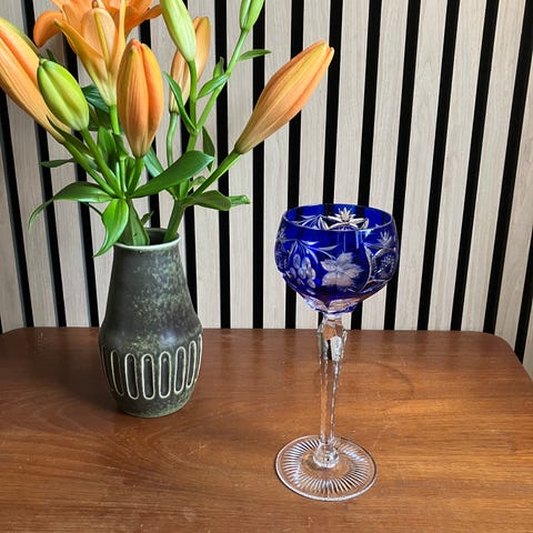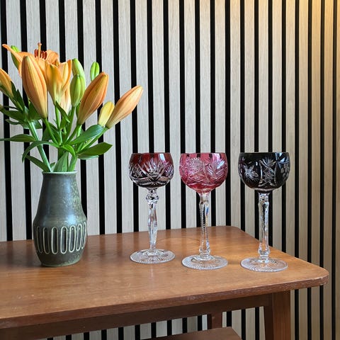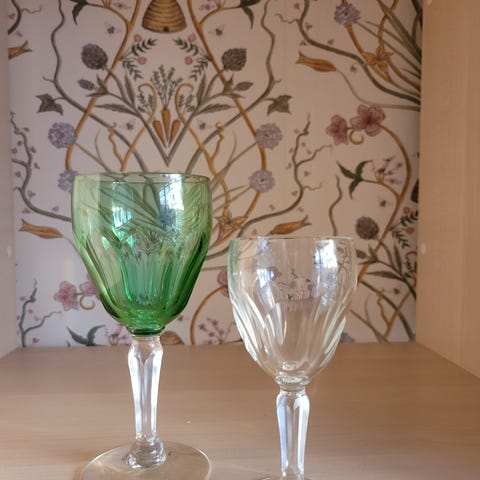 Bøhmiske hvidvinsglas med ens facetslebet sekskantet stilk. De er uden skår eller revner.
