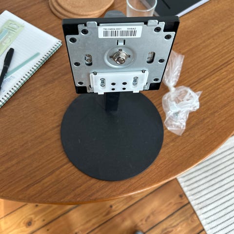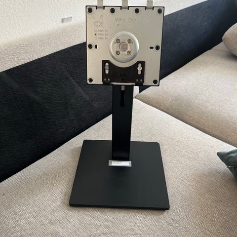 Skærmstand til computerskærm i sort farve. Standeren har rektangulær fod og monteringsbeslag til skærm øverst. Der medfølger skruer i en lille plastpose til montering af skærmen på beslaget. Egnet til brug som bordstand til en computerskærm, hvor skærmen fastgøres via beslagets skruehuller.