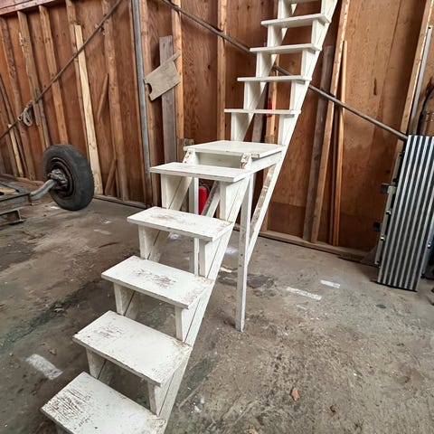 250 cm høj trappe i fyrretræ, 12 trins, snedkerlavet.
