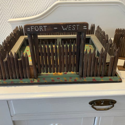 Træ legetøjsfort med flere tilhørende bygninger i western stil. Sættet omfatter et fort med mure og porte samt løse træhuse, blandt andet med skilte som “Sheriff” og “Post”. Alle dele er udført i træ med malede detaljer i hovedsageligt brune og grønne nuancer. Egnet som legetøj eller som samler- og dekorationselement til westernmiljø i miniature.