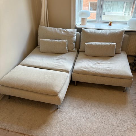 Den er brugt og kræver nok en vask men ellers i god stand. Det den fejler er fnuller i stoffet og så huller på venstre side af 3-personerssiddesektion hvor der før har været skruer som hægtede sig på chaiselongen. Bemærk jeg har ikke de skruer mv der skal til for at sætte den med chaiselongen men mon ikke ikea har det.
