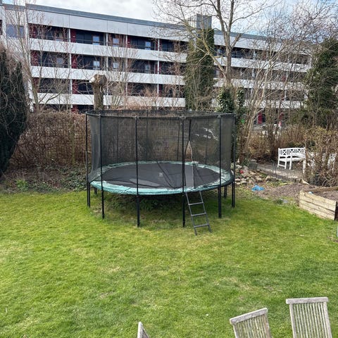 Trampolin - Berg - knap 5 m diameter. Skelet + fjedre + springdug (godt brugt) - sidenet (godt brugt)
