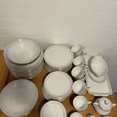 KPM stel i hvidt porcelæn med guldkant. Sættet omfatter forskellige tallerkener, dybe tallerkener, små tallerkener samt serveringsdele som terriner og fade. Klassisk, hvidt stel med reliefdekoration langs kanten og enkel guldkant. Velegnet som middagsstel og serveringsstel til borddækning ved hverdag og fest.