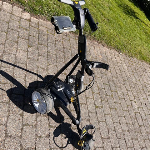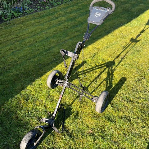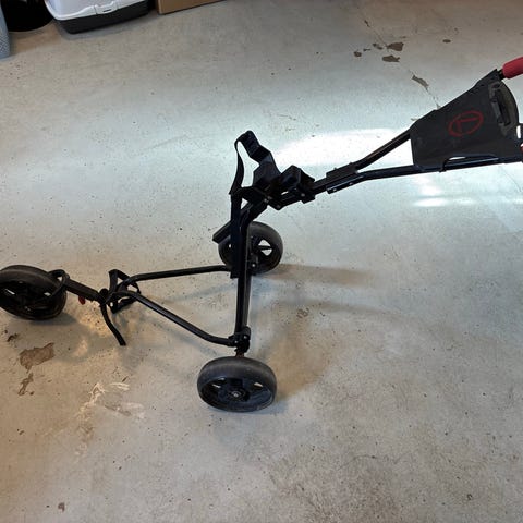 Golfvogn med fire hjul og sammenklappeligt stel. Vognen har stort håndtag og brede hjul, der giver stabil kørsel på forskellige underlag. Den kan foldes kompakt for nem opbevaring og transport. Velegnet til transport af golfbag på golfbanen.