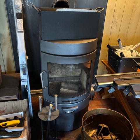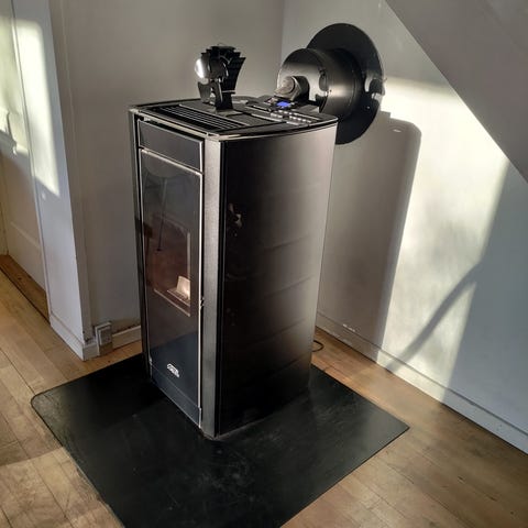 Fritstående pillebrændeovn i sort metal. Ovnen er beregnet til opvarmning af indendørs rum og tilsluttes skorsten via rør i toppen. Fronten har glaslåge, så flammerne kan ses under brug. Betjenes med fjernbetjening. Skal tilsluttes el. Ovnen er installeret i et sommerhus i 2013.