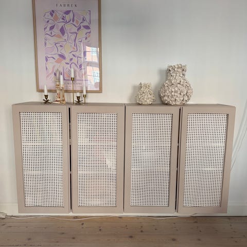 Flot vedligeholdt reol system fra IKEA med hvidt fransk flet og malet i en sart rosa/beige farve.