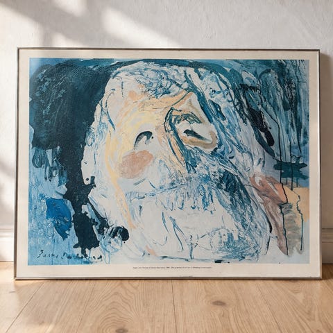 Billedet er indrammet i en enkel sort ramme med glas. Rammen har synlige brugsspor i to af hjørnerne.