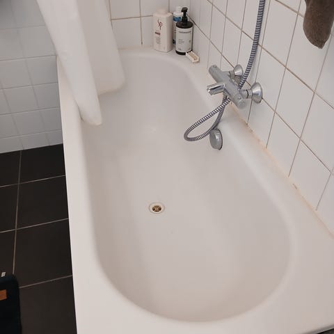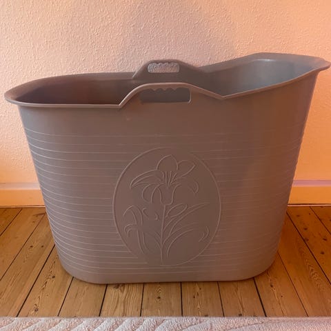 Stor voksen badekar . Brugt sparsomt . bundprop , “afløb” /slange , overtræk medfølger .