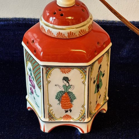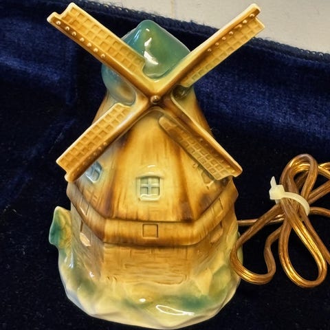 35. Rigtig fin ozon lampe i porcelæn af vandmølle med fatning og pærer sælges for 200,00 kr. Den er 16 cm høj, 13,5 cm bred og 10 cm dyb. Fremstår hel og fin uden afslag. Kan sende med GLS og Dao.