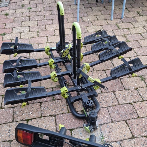 Buzzwing4 Cykelholder til anhængertræk med plads til 4 cykler. Modellen er sammenklappelig for lettere opbevaring, og har justerbare holdere med gule låseanordninger til fastgørelse af cyklernes stel og hjul. Konstruktionen er i metal med plastdele. Velegnet til transport af cykler bag på bilen via anhængertrækket.