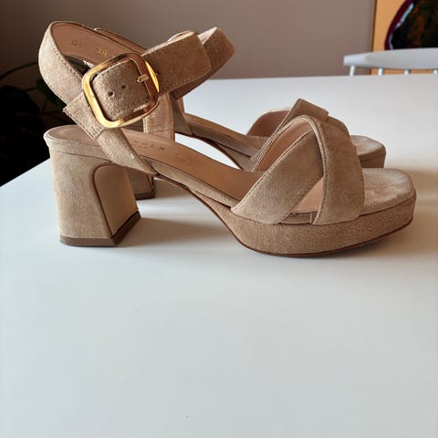 Gabor sandaler i str. 38. Sandalerne har flere krydsende remme over foden og justerbar rem med spænde om anklen. De har en middelhøj blokhæl og åben tå. Farven fremstår som brun/nude. Velegnet som hverdagssandal eller til pænere brug.