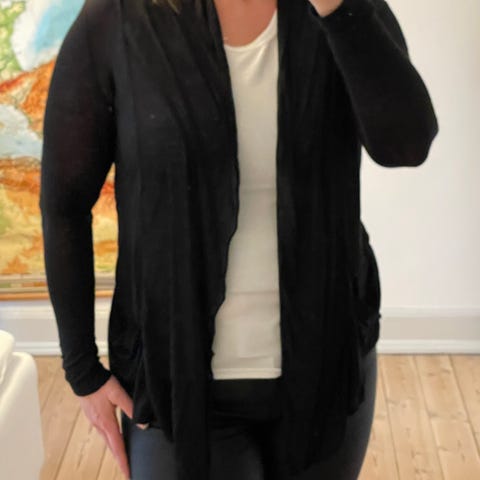 Med lommer. I 95 % polyester og 5 % spanden. Str M.