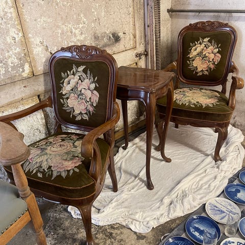 Stolene har været i min famile i over 70 år. Fint udskåret og charmerende bemalet. Snoreflet renoveret i 90’erne. De er fra min mor, men jeg bor for småt for at kunne beholde dem. De skal derfor gerne videre til en der vil værdsætte dem.