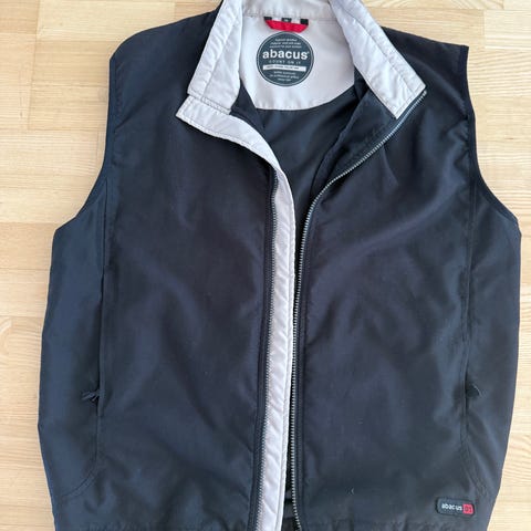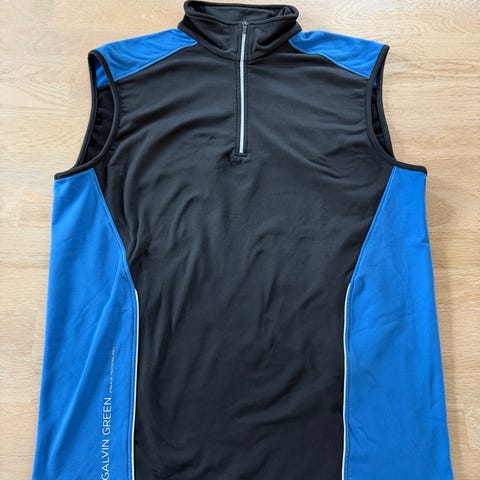 Ærmeløs vest i blå farve med gennemgående lynlås foran. Vesten har elastisk kant nederst og er uden synlige lommer.