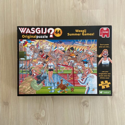Jumbo Wasgij Original Puzzle 35 Car Boot Capers puslespil. Motivet viser en travl bilstumpemarkedsscene med mange figurer og detaljer. Puslespillet leveres i original æske med brikkerne samlet i en pose. Velegnet til puslespilsentusiaster, der kan lide humoristiske og detaljerede motiver.