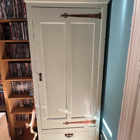 Bemærk: Der er kun nøglehul – selve låsen mangler, så skabet kan åbnes uden nøgle. Der er også nogle pletter, som kan ses ved nærmere kig, men det påvirker ikke funktionaliteten. Det trænges til at blive malet.