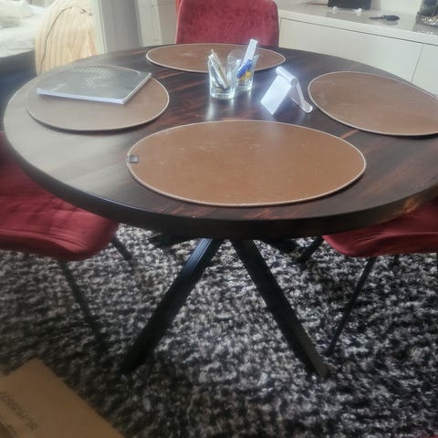 Rundt spisebord på stål fod. (foden er tung og derfor står bordet stabilt).