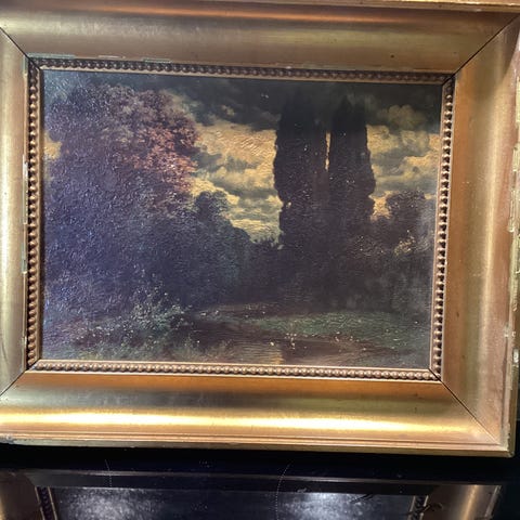 Maleri med landskabsmotiv i ramme. Billedet viser et naturmotiv med træer og to personer i forgrunden udført af Corot. Ca. 1865
