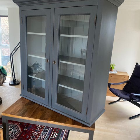 Malet antracitgrå udvendigt for ca. 1 år siden. Har 3 hylder samt en skuffe. Skuffe er lidt træg at åbne. Låge binder lidt.