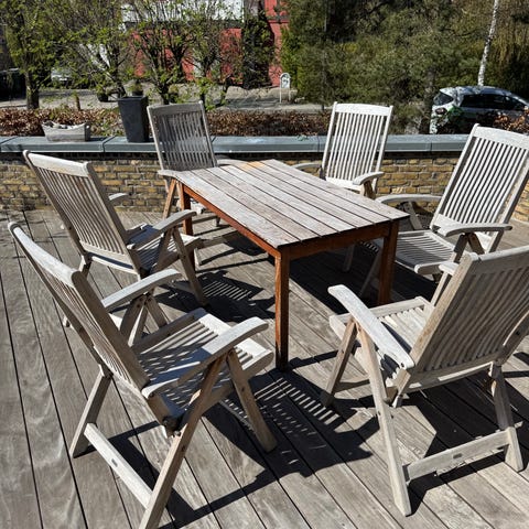 Havebord i teaktræ og 3 positionsstole med hynder. Overfladerne fremstår patineret af vejret. Trænger til slibning. En stol mangler en lamel. Har et lille hul.