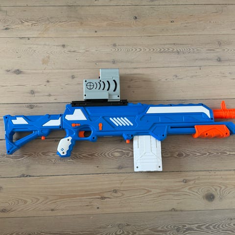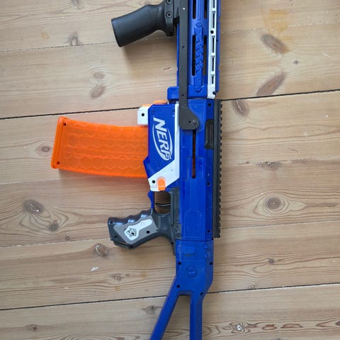 Nerf Longshot opgraderet. Alt er blevet udskiftet til mere robuste dele, hvilket gør den i stand til at skyde længere og mere præcist.