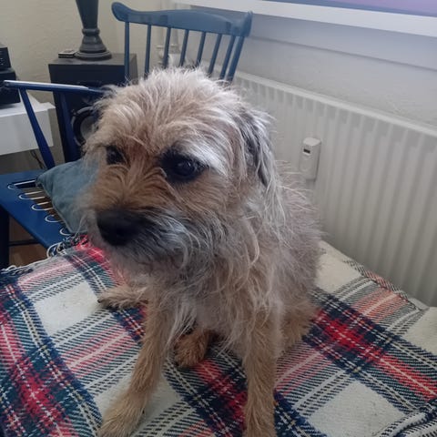 Og han er ikke så glad for at være alene hjemme han har ikke ødelagt noget her hjemme men han gør lidt når man går