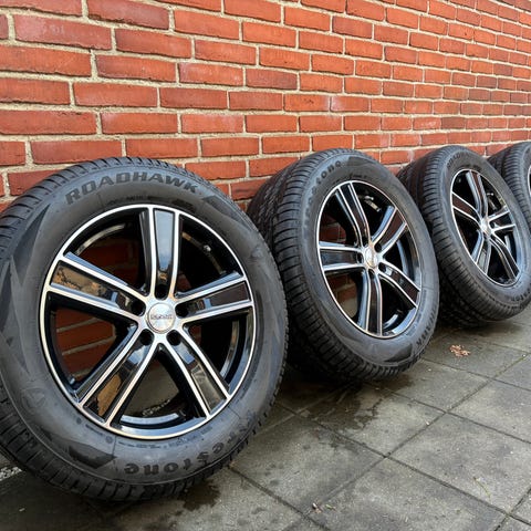 Alutec alufælge med dæk i størrelsen 215/60R16. Dækkene er monteret på 16" alufælge med 5 eger. Egnede som komplet hjulsæt til biler, der passer til denne dimension og fælgtype. Mønsterdybden fremgår af billedet med tommestok og kan bruges til at vurdere restlevetid på dækkene.
