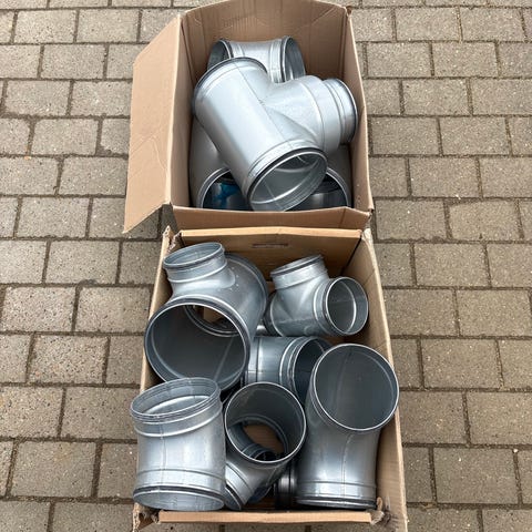 Sæt med ventilationsdele bestående af flere firkantede og runde fittings samt en lang isoleret fleksibel ventilationsslange. De firkantede dele omfatter blandt andet rammer og gennemføringer, mens de runde dele omfatter ringe og overgange til rør. Velegnet til opbygning eller udvidelse af ventilations- eller udsugningssystem i bolig, værksted eller lignende, hvor der er behov for tilslutning mellem forskellige ventilationskomponenter.