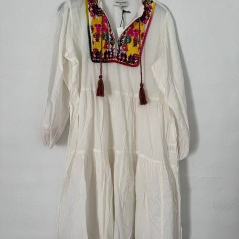Pæn, lang sommerkjole i størrelsen medium, med bælte. Flot hindbær farve.