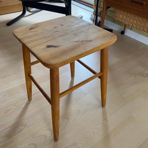 Fed gammel skammel i træ med patina og malerpletter. Måler 35 x 35 x 45