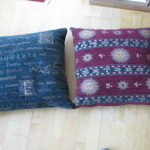 Fabrikat Foverskov - 50x50cm og man kan vel sige 15cm tykke (de er som puder er flest ret tynde langs kanterne. OG 2 mindre puder 35x35cm med samme betræk. Der kommer et billede med alle 3. Dekorativt betræk- mønster se billeder. Betrækket er af: viscose,bomuld, polyester. Det kan åbnes med lynlås og vaskes separat. Pudefyld er andefjer Puderne er i glimrende stand og som nævnt fra hjem uden røg & dyr - Helst samle salg 500kr - med passende overtalelse den store for 275 - og de 2 små 275kr