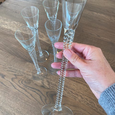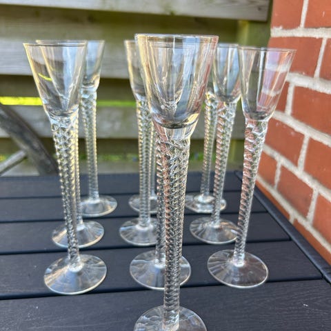 Holmegaard snapseglas amager twist med lange, slanke stilke i klart glas. Glassene har en dekorativ struktur på stilken og en smal, høj kumme, der egner sig til servering af f.eks. dessertvin, likør eller anden drik i mindre mængder.